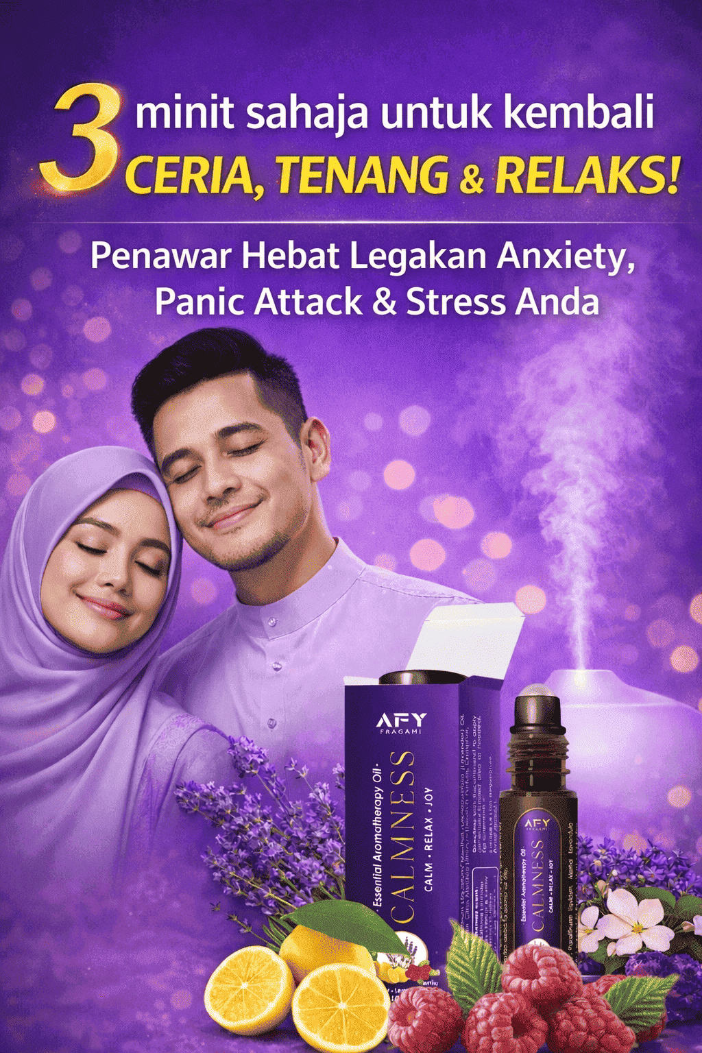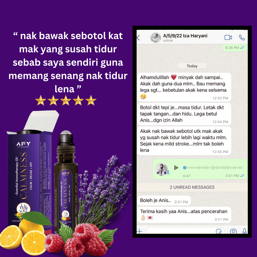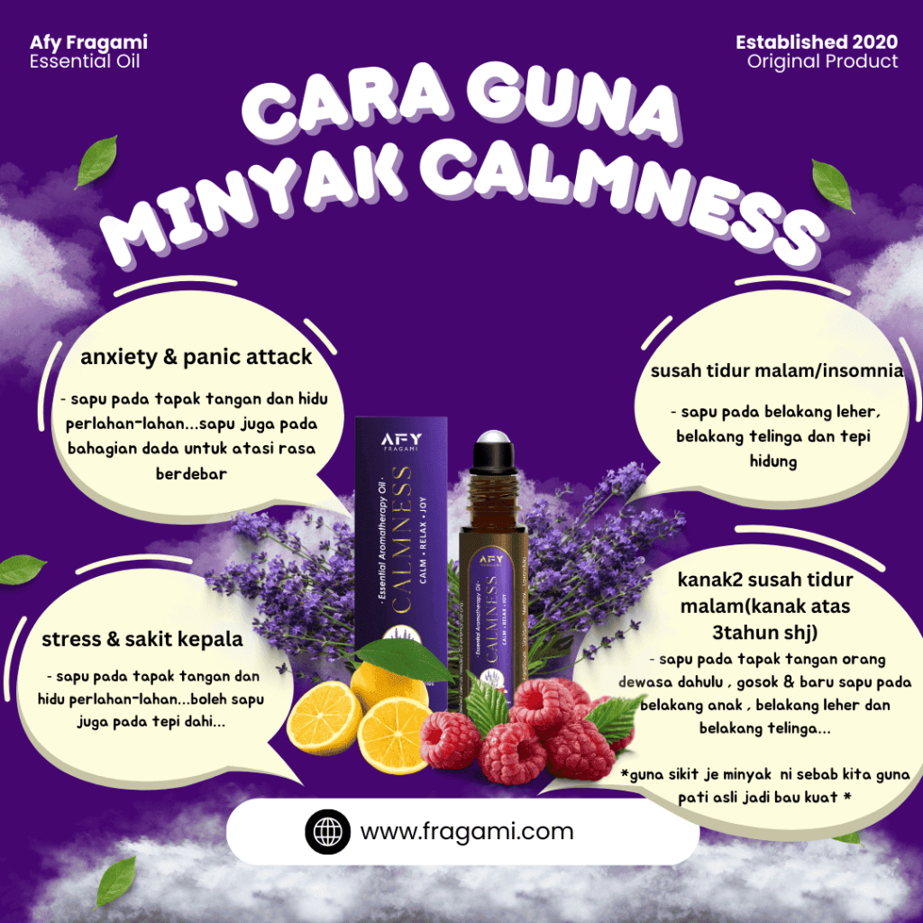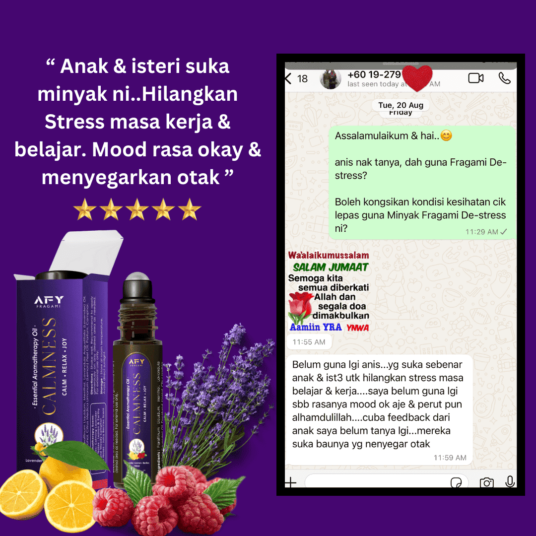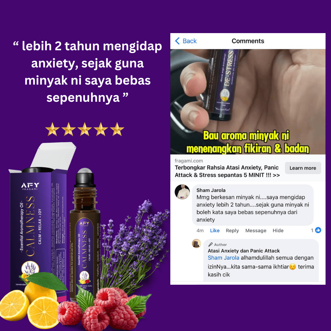 Minyak ajaib ini bukan setakat melegakan anxiety, panic attack, stress, migrain, dan insomnia, tapi ia berkesan sepantas 3 minit! Tak perlu tunggu lama-lama untuk rasa lega dan gembira ceria balik.